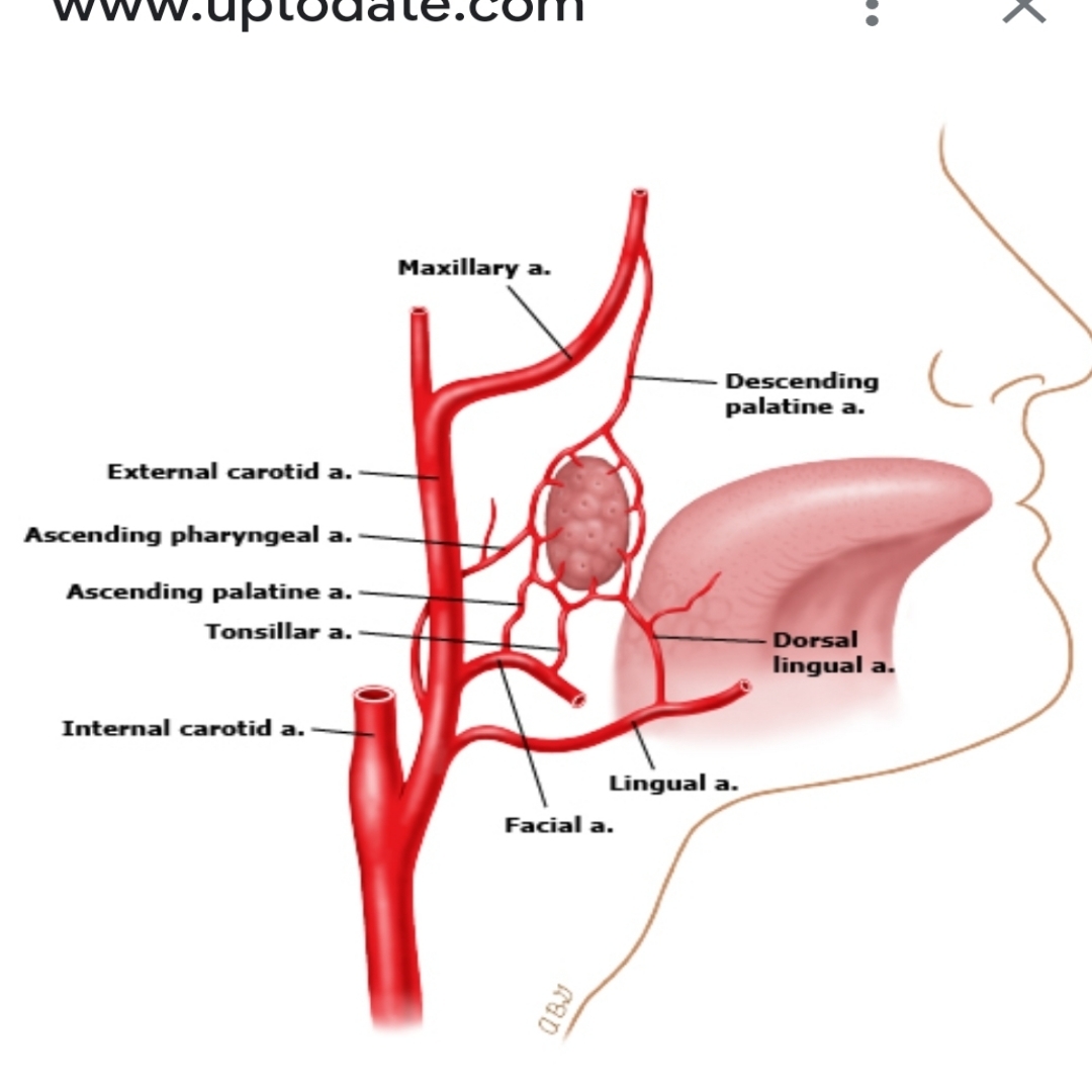 b) List two arteries that supply blood to the tonsils. (2 marks)