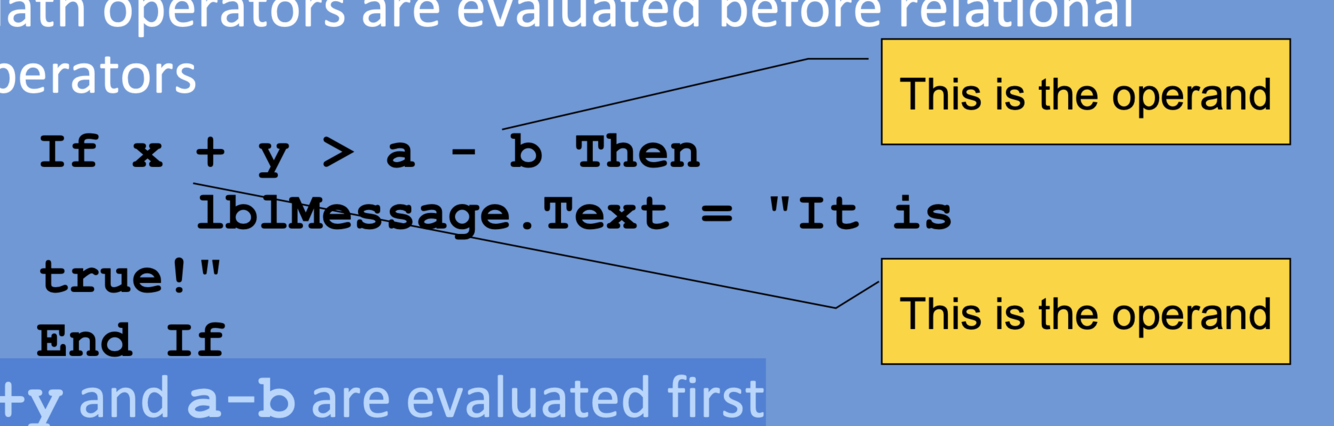 Relational operators use two operands, e.g.length>width Islengthgreaterthanwidth?