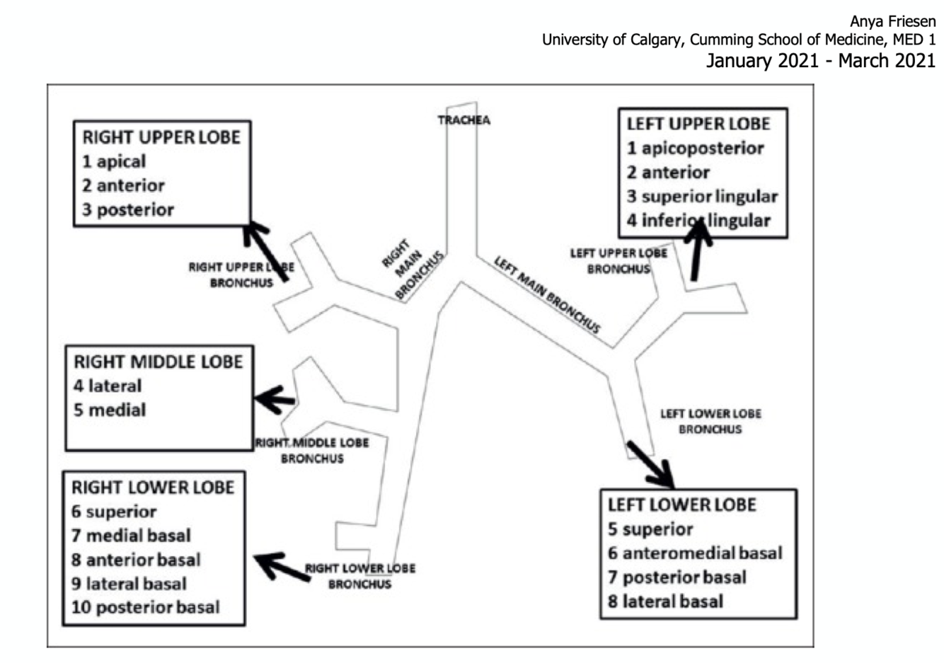 The bronchial tree is a series of passages that supplies air to the alveoli of the lungs. It begins with the trachea, which divides into a left and right bronchus.