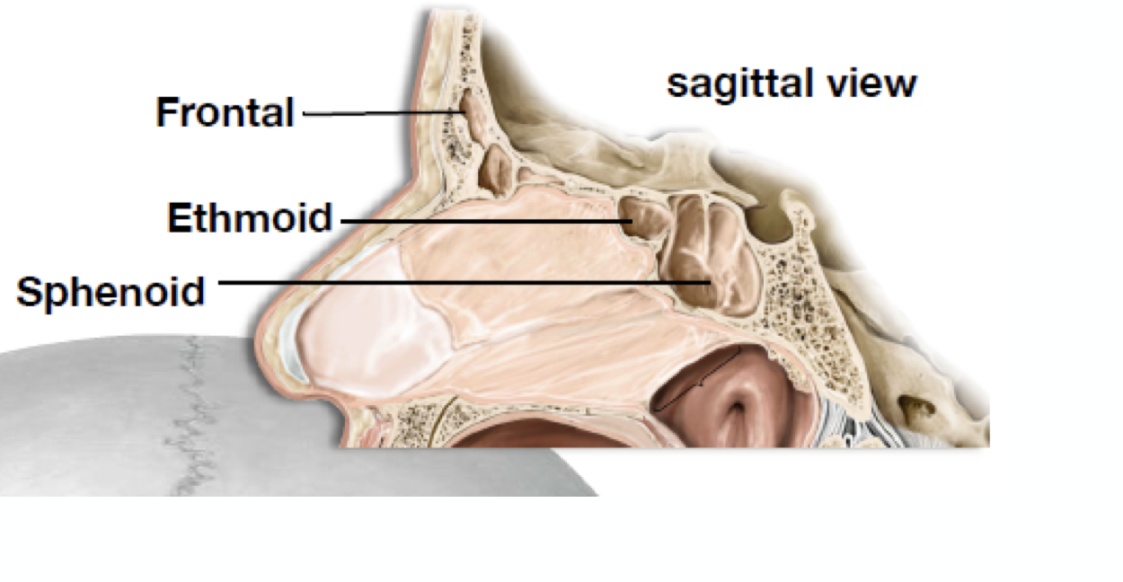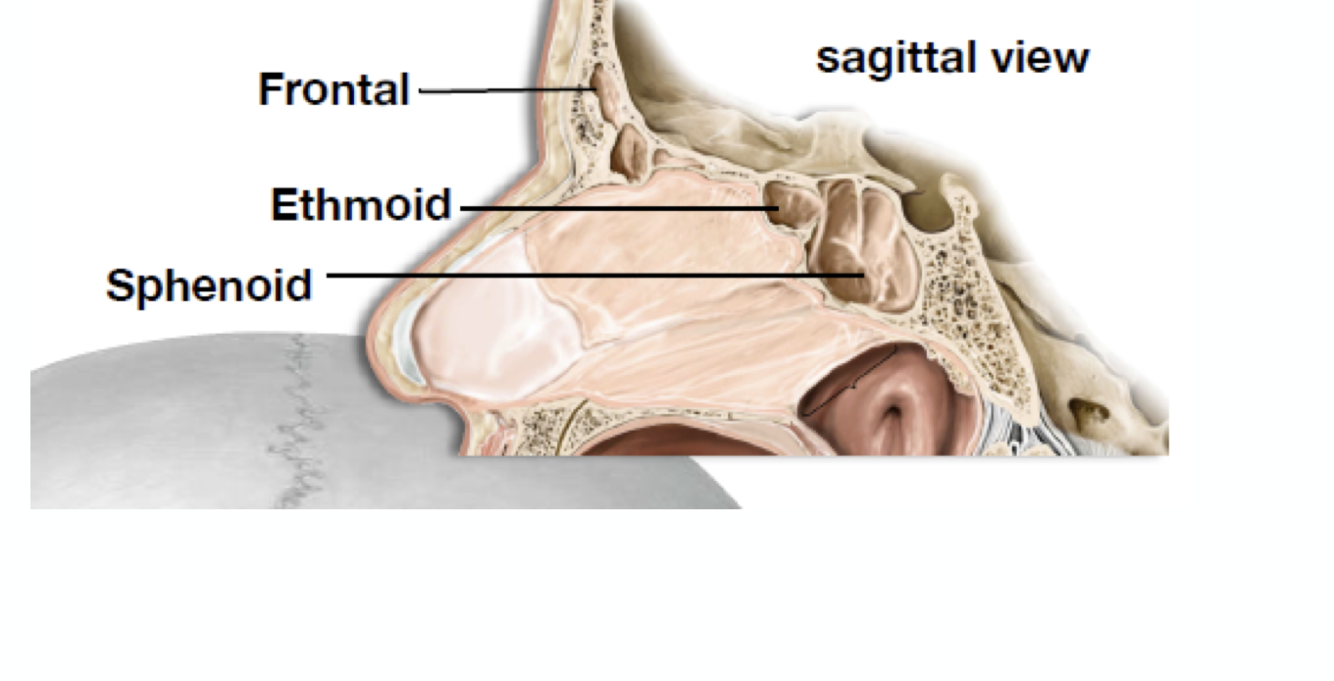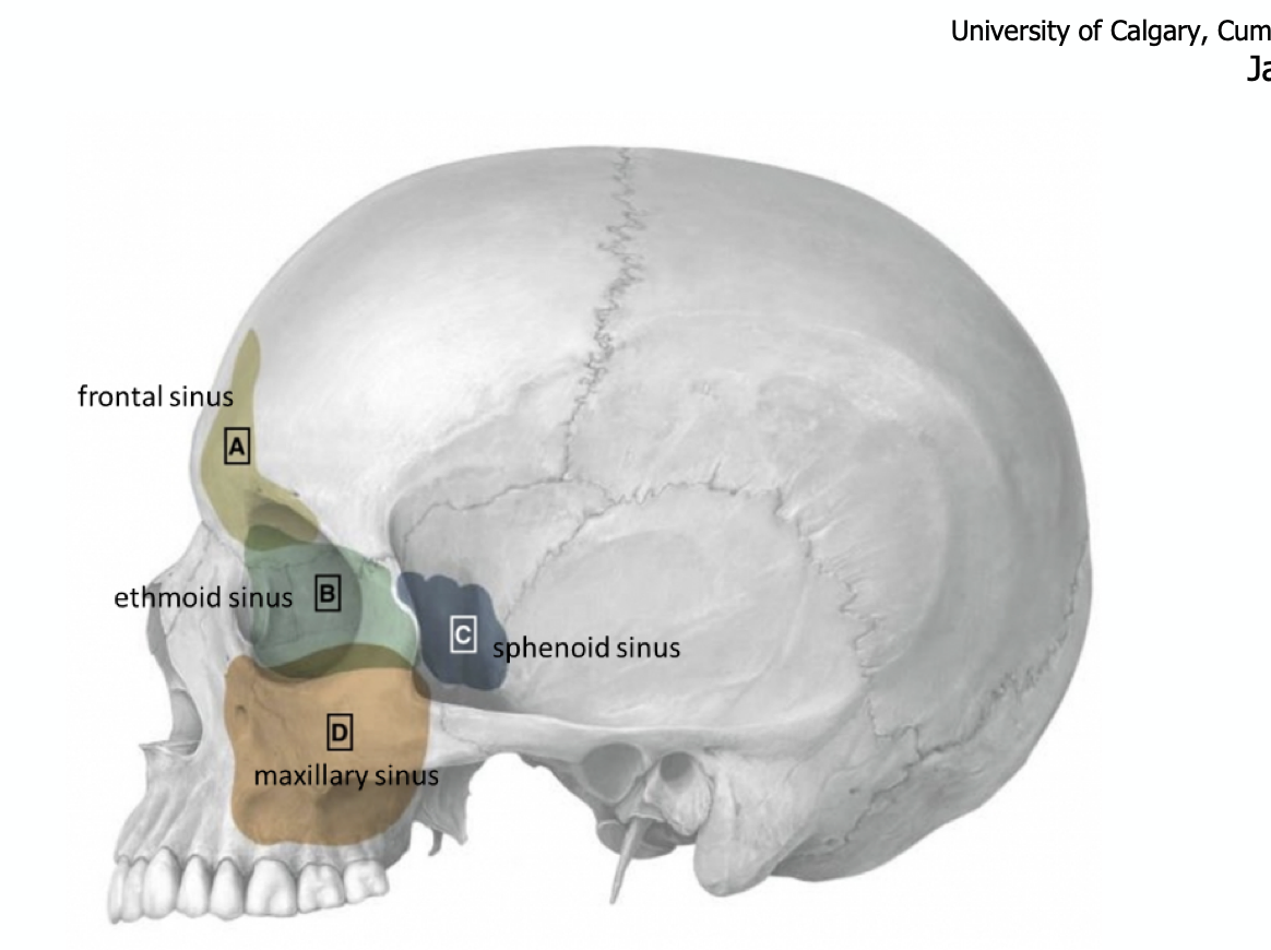 The paranasal sinuses are air-filled extensions of the nasal cavity. There are four paired sinuses – named according to the bone in which they are located – maxillary, frontal, sphenoid and ethmoid. Each sinus is lined by a ciliated pseudostratified epithelium, interspersed with mucus-secreting goblet cells. The sinuses increase surface area for exchange of heat and moisture
