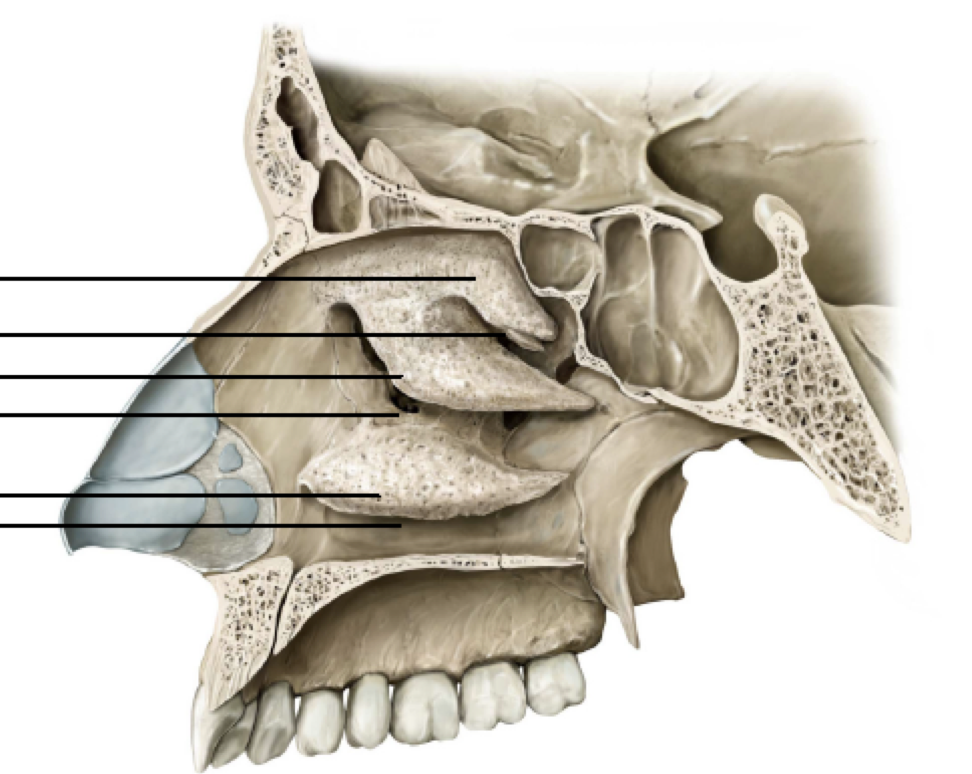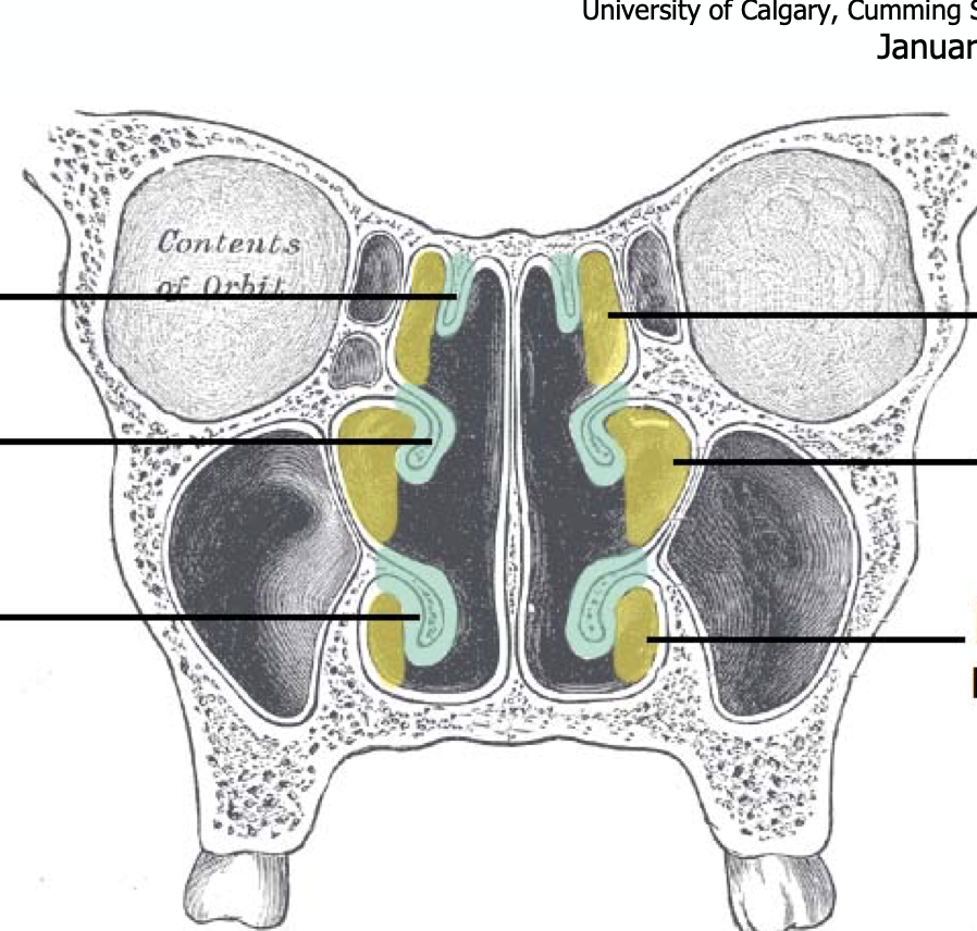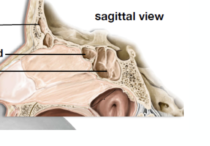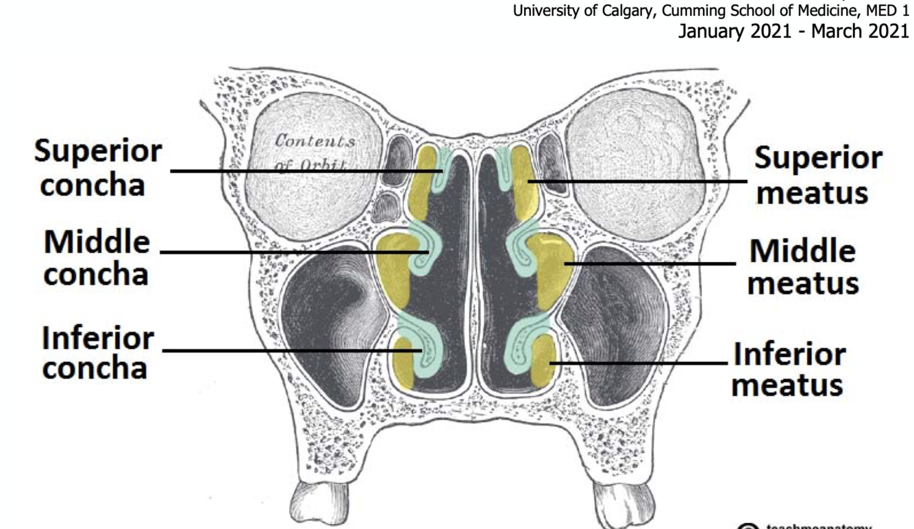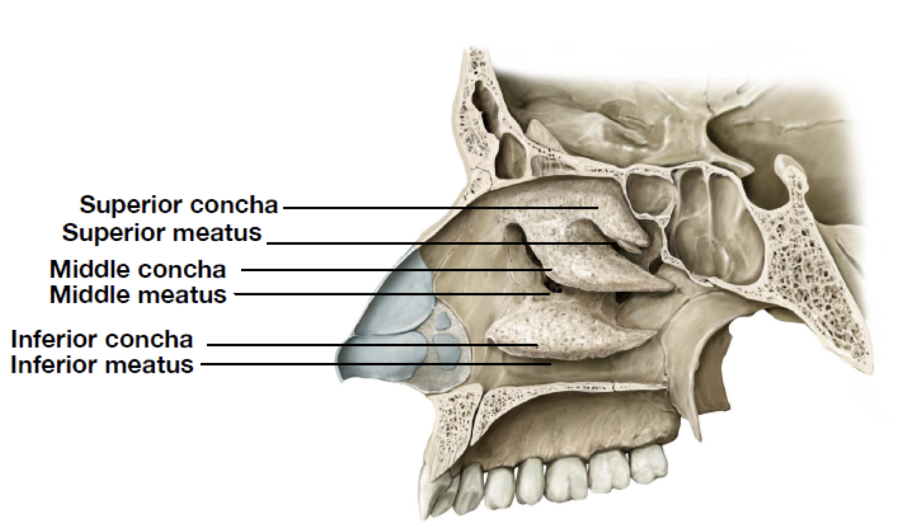 Projecting out of the lateral walls of the nasal cavity are curved shelves of bone. They are called conchae (or turbinates). The are three conchae – inferior, middle and superior. They project into the nasal cavity, creating four pathways for the air to flow. These pathways are called meatuses: