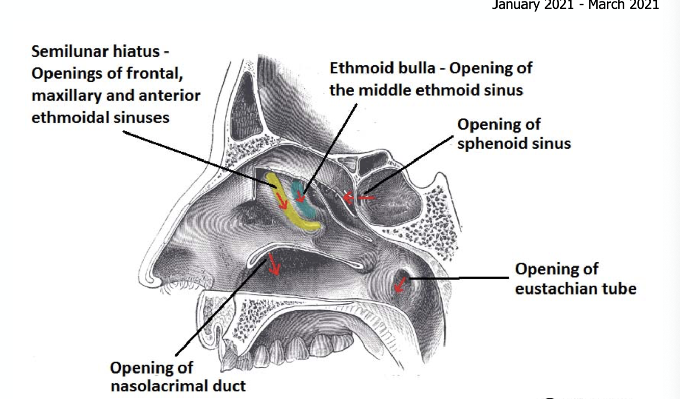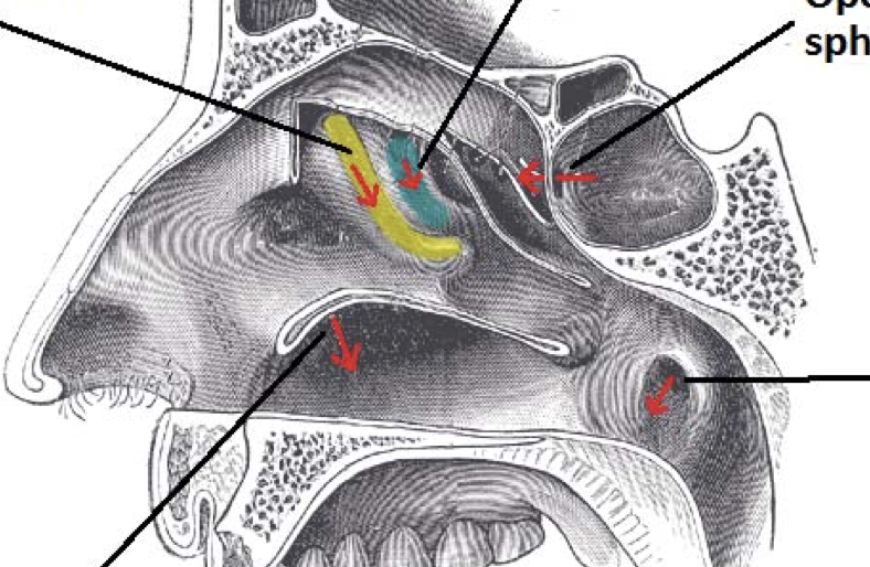 • Spheno-ethmoidal recess – superiorly and posteriorly to the superior concha.