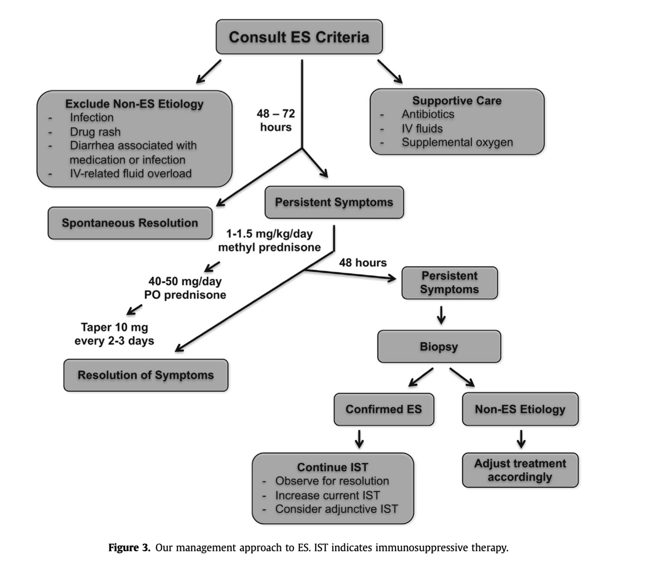 A decisão de tratamento depende da gravidade dos sintomas e da exclusão de outras causas. Quando indicado, o tratamento sugerido é metilprednisona 1-1,5mg/kg/dia até início de melhora de sintomas (que geralmente ocorre dentro de 48h), seguido de uma redução para 40-50mg de prednisona por 2-3 dias. A prednisona pode ser desmamada 10mg a cada 2-3 dias desde que os sintomas continuem a melhorar.