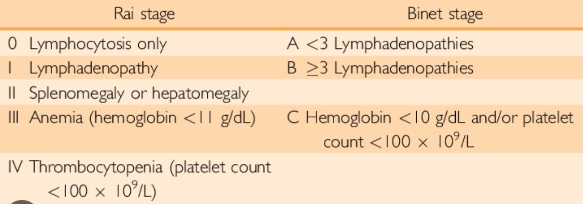 A LLC é uma doença linfoproliferativa de curso indolente. Ela pode ser estratificada através de achados clínicos e laboratoriais com escores clínicos (RAI e BINET). Não é necessário usar TC para avaliação de conglomerados nodais, a não ser que se suspeite de massa abdominal com sintomas compressivos.