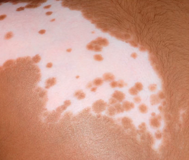 Doença crônica relacionada à perda dos melanócitos, causando áreas de despigmentação cutânea em várias extensões. A causa é desconhecida, mas fatores genéticos e autoimunes são prováveis.