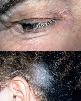 Pode afetar sim, cílios inclusives, muito característicos (leucotriquia ou poliose, o pelo fica branco)