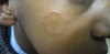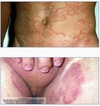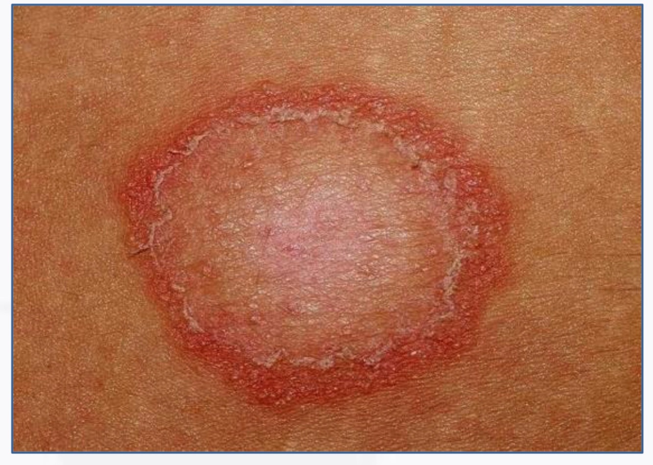 Lesi berbatas tegas, tepi aktif/meninggi, central healing, tepi polisiklik.