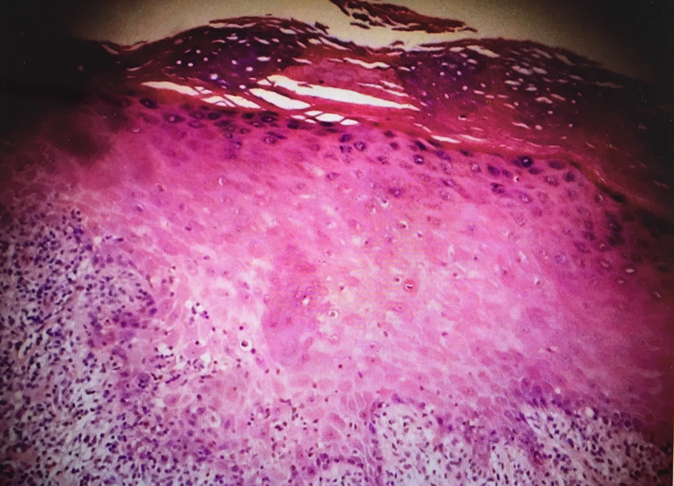 Skin Biopsy = Acantholysis (Desmosome-connected Stratum Spinosum separation)