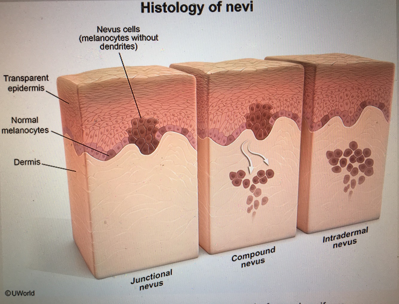 Benign [Melanocyte proliferations] involving BOTH Epidermis AND Dermis –> raised papules with symmetrical borders