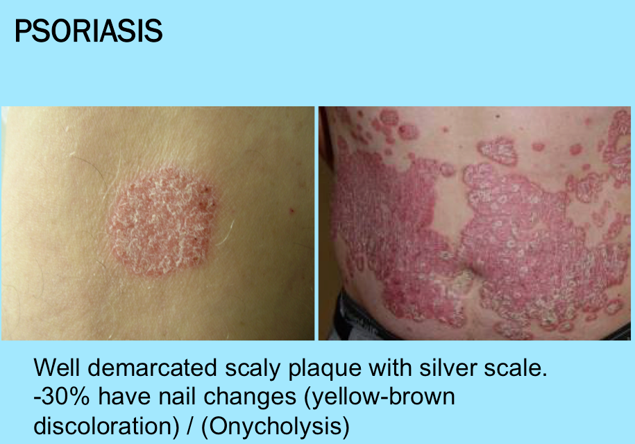 PSORIASIS: Plaque/Silver scales/Onycholysis/[Rigid border=Well Demarcated]/[Inappropriate Nail Discoloration]/[Auspich sign]/[Scales tht are WAFTER like]/[Dilated blood vessel]/[Skinny Suprapapillary plates (thin stratum granulosum + parakeratotic corneum)]