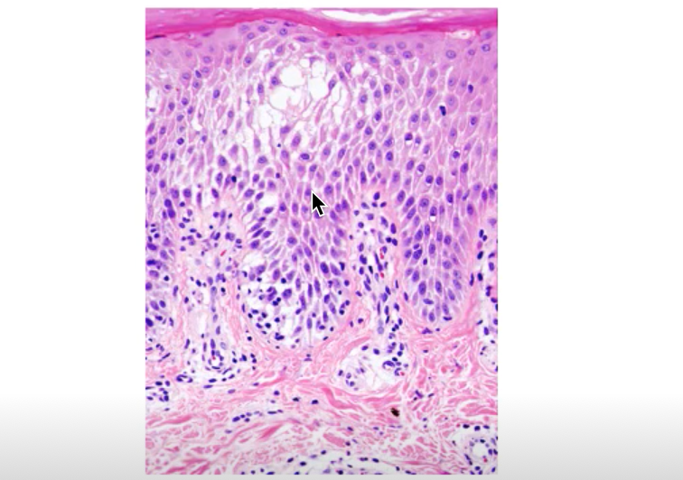hyperproliferation - cells are moving up from the basal layer to the stratum corneum before they have lost their nuclei