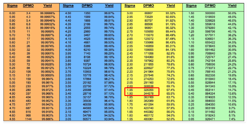Calculate the process capability is through the number of defects per opportunity. The acceptable number to achieve six sigma is 3.4 Defects Per Million Opportunities (DPMO).