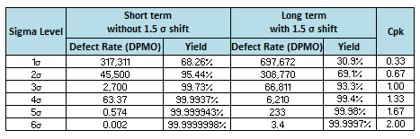 Process sigma = 3* Cpk. Hence We generally want a Cpk of at least 1.33 [4 sigma] or higher to satisfy most customers.