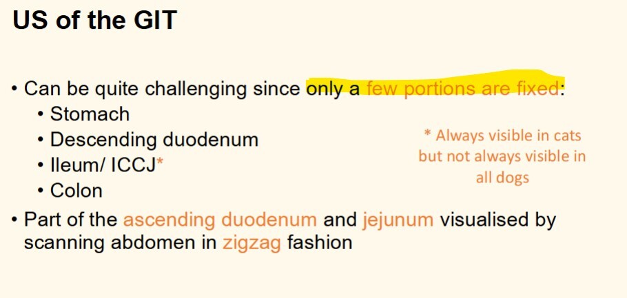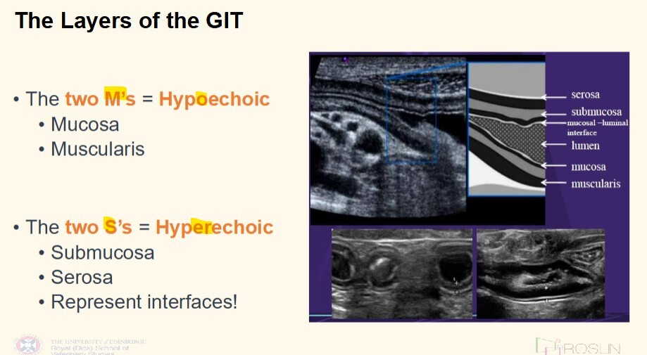 between the 4 anatomical surface layers of the GIT, which are hyperechoic?
