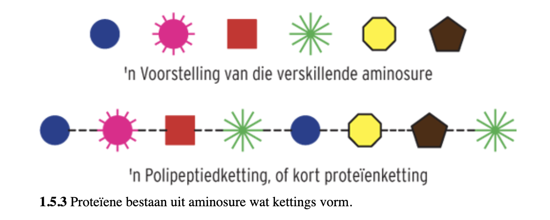 Kyk na figuur 1.5.3 oor Proteïne wat bestaan uit aminosure wat kettings vorm.