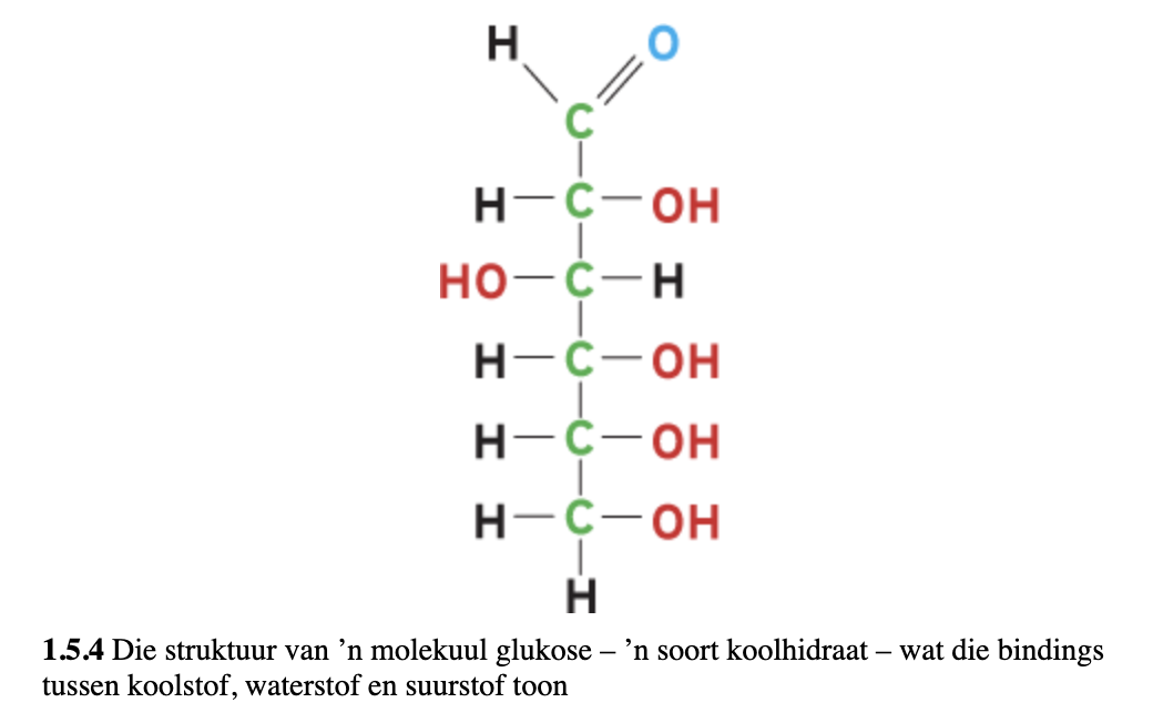 Kyk na die struktuur van ‘n molekuul glukose - ‘n soort koolhidraat - wat die bindings tussen koolstof, waterstof en suurstof toon in figuur 1.5.4.