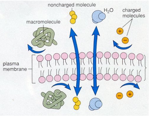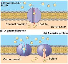 the diffusion of solutes or water through channel proteins or carrier proteins in the plasma membrane (the lipid bilayer does not allow polar molecules and ions to go through)