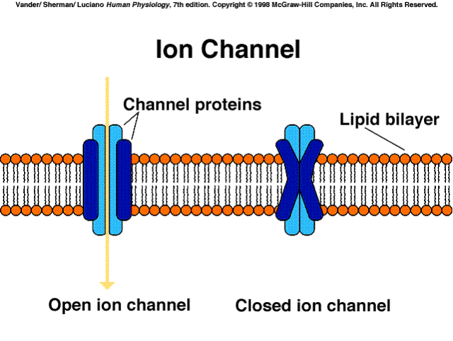 ion channels, which function as gated channels that open or close in response to a chemical or electrical stimulus (some ions include: Na+, K+, Ca2+, or Cl-)