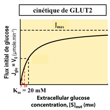 En cas de diminution d’insuline, endocytose et retrait membranaires du GLUT4 => Diminution de Jmax (Km inchangé).