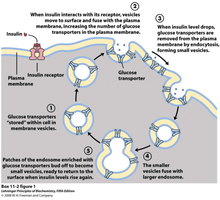 La présence d’insuline induit l’incorporation par la mb plasmique (des cellules musculaires, et adipocytes) des GLUT4 contenus dans les vésicules sous-membranaires. Ce qui augmente Jmax et le Km reste inchangé (5mM).