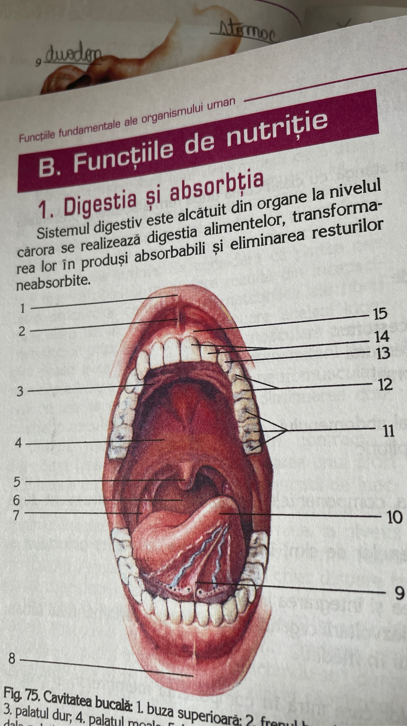 1-buza superioara 2-frenulum buzei superioare 3-palat dur 4-palat moale 5-lueta 6-cavitatea faringiana 7-amigdala palatina 8- buza inferioara 9-frenul lingual 10-limba 11-molari 12-premolari 13-canini 14-incisivi 15-gingie