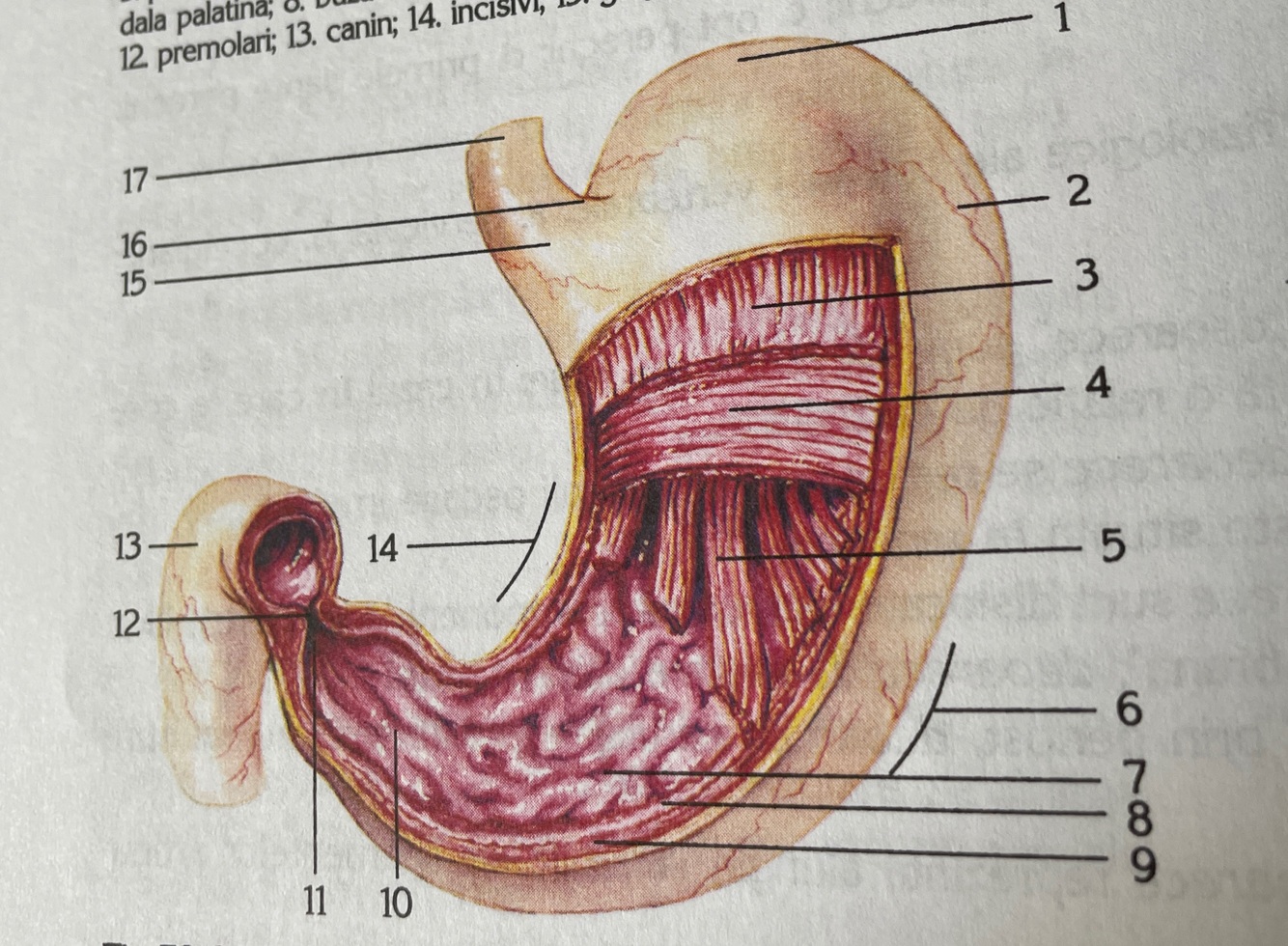 1-fundul stomacului 2-corpul gastric 3-muschi longitudinal 4-muschi circular 5-muschi oblic 6-curbura mare 7-plicile mucuoasei 8-mucoasa 9-submucoasa 10-antru piloric 11-canal piloric 12-sfincter piloric 13-duoden 14-curbura mica 15-adventicea 16-cardia 17-esofag