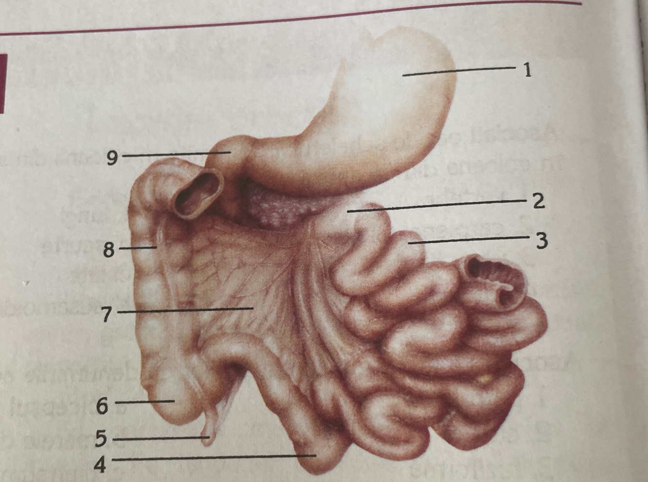 1-stomac 2-flexura duodeno-jejunala 3-jejun 4-ileon 5-apendice vermiform 6-cec 7-mezenter 8-colon ascendent 9-duoden
