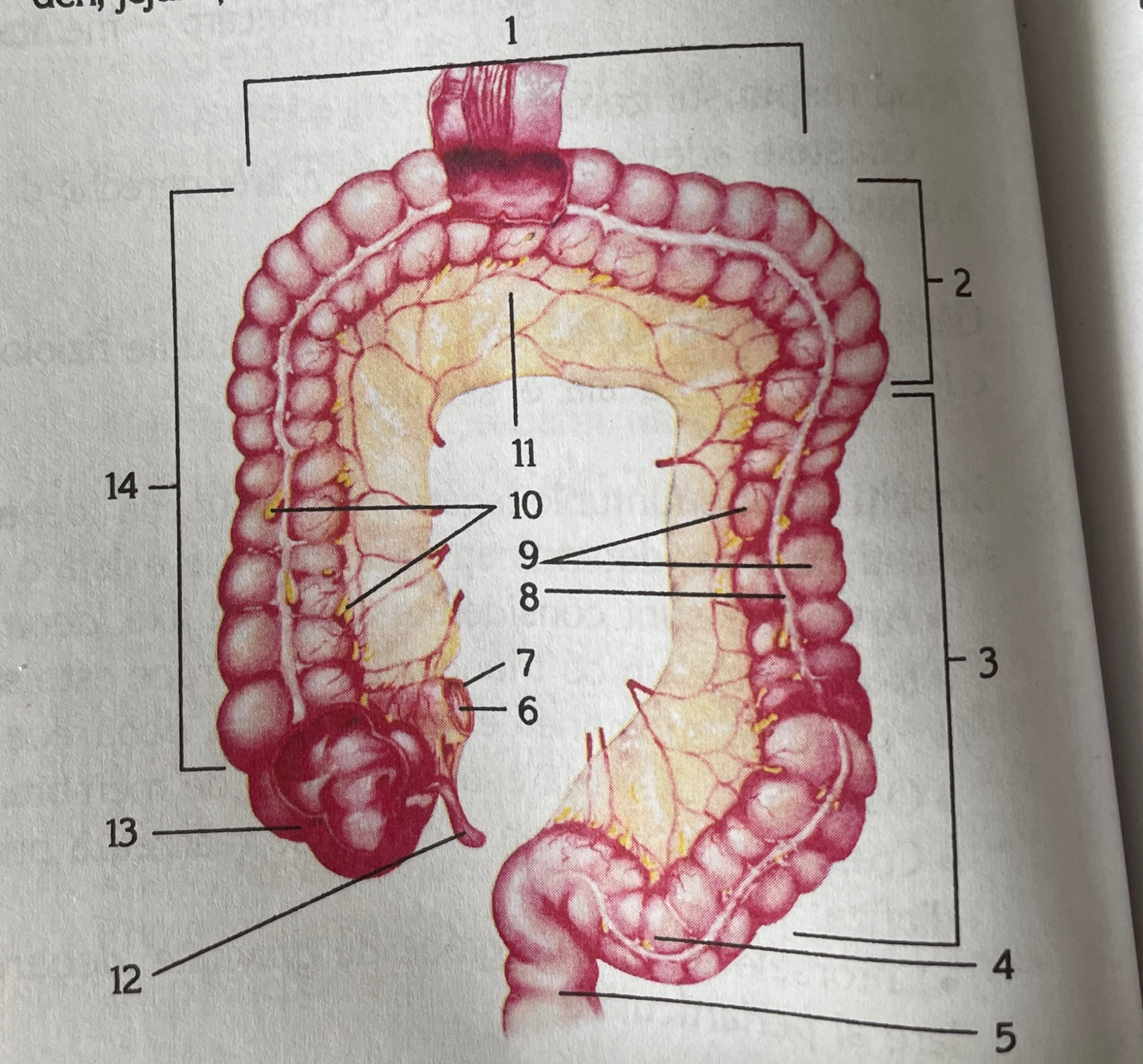 1 Colon transvers 2 flexura colica stanga 3 colon descendent 4 colon sigmoid 5 rect 6 valvula ileo cecala 7 ileon 8 tenii(benzi musculare) 9 haustre 10 apendice epiploice (adipoase) 11 mezocolon 12 apendice vermiform 13 cec 14 colon ascendent