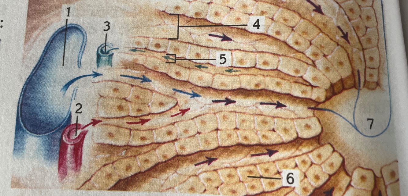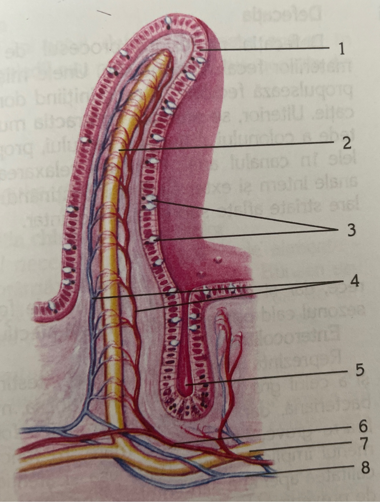 1 epiteliu 2 vas chilifer central 3 celule secretoare Brunner 4 retea capilara 5 cripta intestinala Lieberkuhn 6 arteriola 7 vas limfatic 8 venula