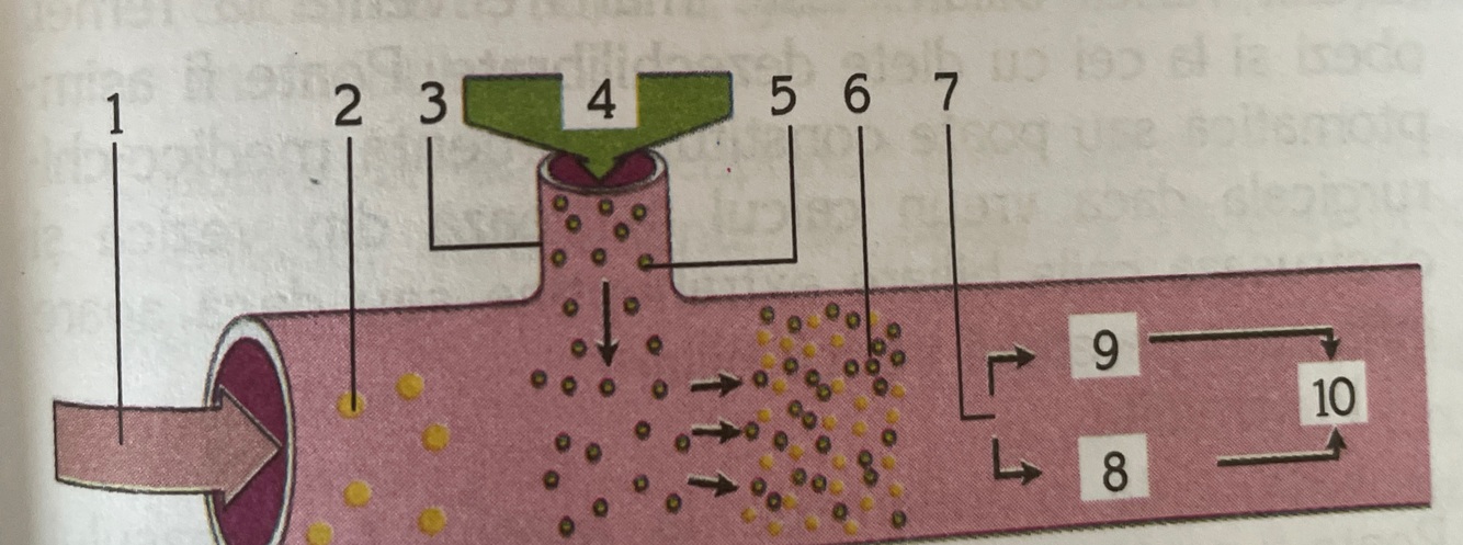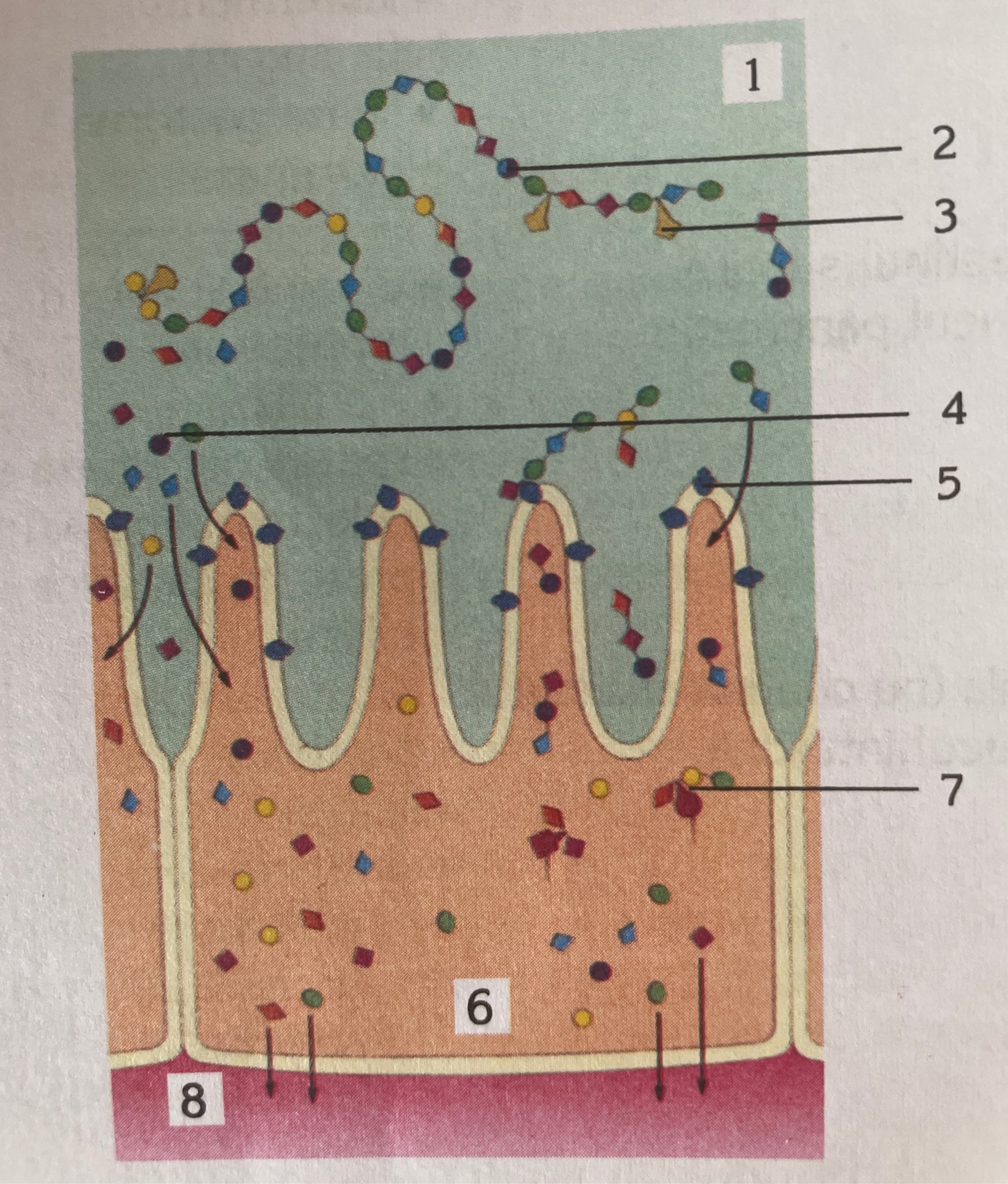 1 lumen intestinal 2 lant polipeptidic 3 peptidaza 4 aminoacizi 5 enzime ale marginii in perie 6 celula epiteliala 7 tripeptidaza 8 capilar sangvin