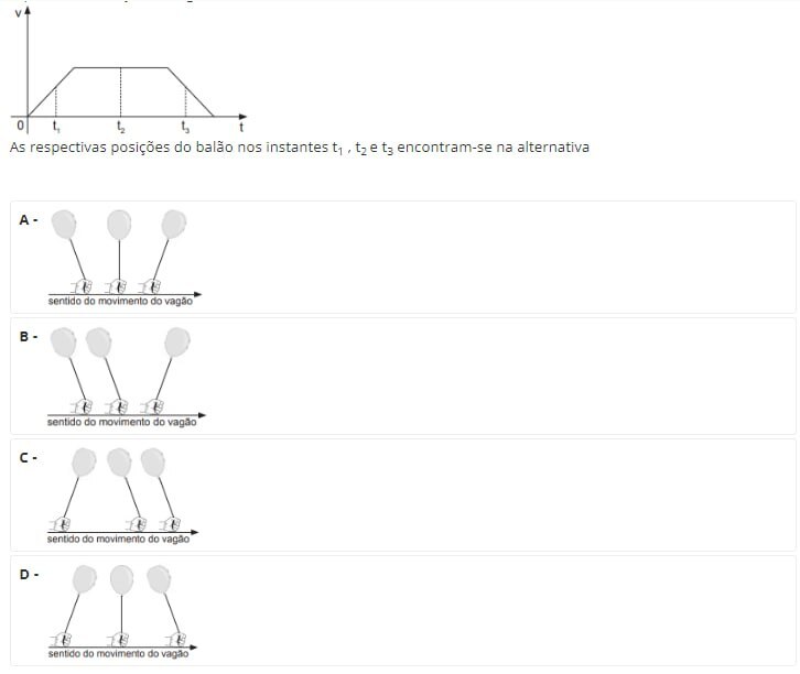 Uma criança embarca em um dos vagões do Trensurb segurando um balão que contém, em seu interior, gás hélio. Enquanto o trem está parado, o balão encontra-se na posição vertical. O gráfico a seguir representa a velocidade medida para o vagão do Trensurb em que a criança embarcou em função do tempo necessário para ele se movimentar entre duas estações consecutivas.