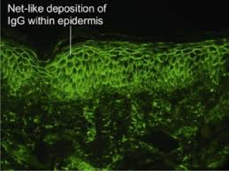 Describe immunofluorescence of pemphigus vulgaris