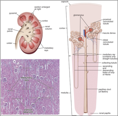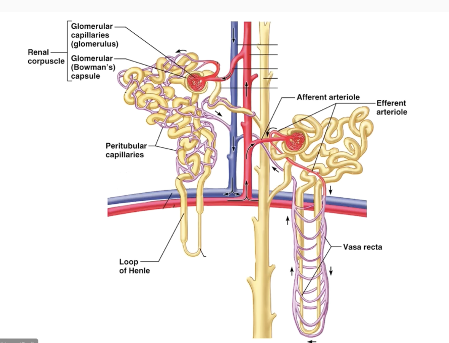 T/F: A nephron consists of a renal corpuscle and associated tubules, except the collecting ducts.