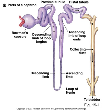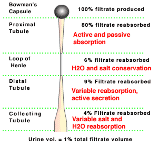Glomerulus–> Bowmans capsule–> Proximal Convoluted tubule–> Loop of Henle–> Distal convoluted tubule–> collecting tubule —> collecting duct