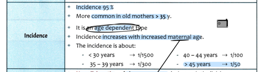 • Non-disjunction of chromosome 21 during meiotic division (80 % in maternal meiosis I)