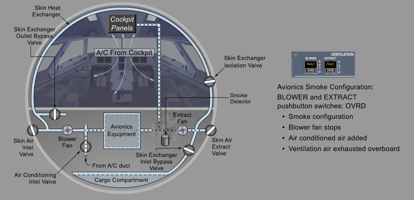 blower and extract are set to override, the air conditioning is supplying cooling air which is then exhausted overboard via a partially open skin air outlet valve.