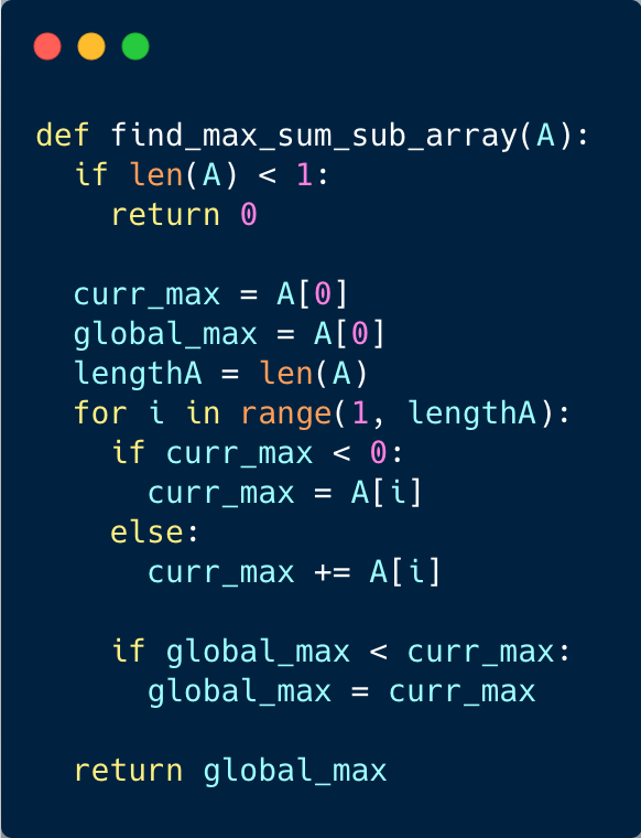 The basic idea of Kadane’s algorithm is to scan the entire array and at each position find the maximum sum of the subarray ending there. This is achieved by keeping a current maximum for the current array index and a global maximum. The algorithm is as follows: