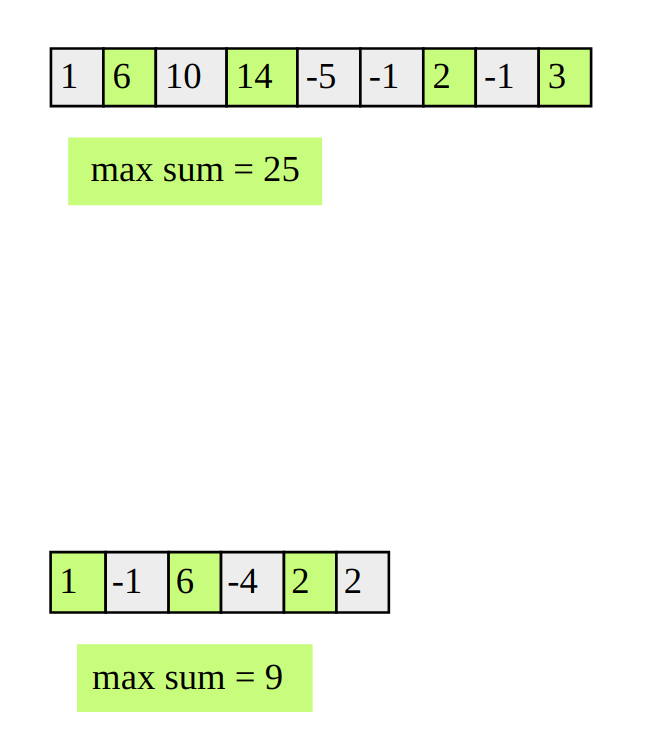 Find an efficient algorithm to find the maximum sum of a subsequence in an array so that no consecutive elements are part of this subsequence. Consider the following examples; the max sums of a subsequence with no consecutive elements in the below examples are 25 and 9 respectively.