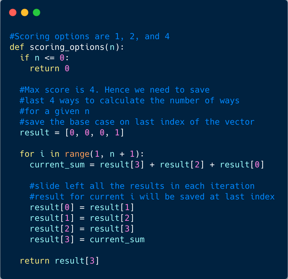 We’ll use the dynamic programming approach to build the solution bottom-up. We’ll store the results in a fixed size array. Scoring options are 1, 2, and 4. The maximum score is 4, so we need to save the last four ways to calculate the number of ways for a given ‘n’. On each iteration, the result will be the sum of values present at the 3rd, 2nd, and 0th index of the results array. This is because the result at ‘n’ is the sum of values at n-1, n-2 and n-4. We’ll slide the results towards the left and save the current result at the last index.