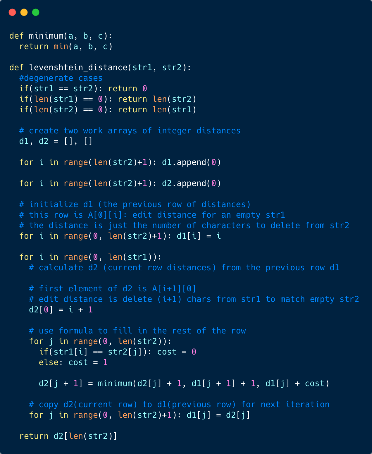 calculate d2 (current row of distances) from the previous row d1 as follows: d2[0] = i + 1 for each j from 0..n