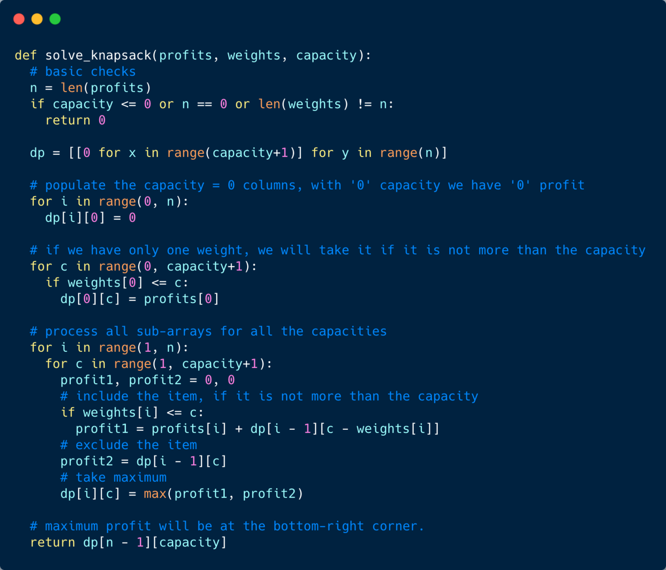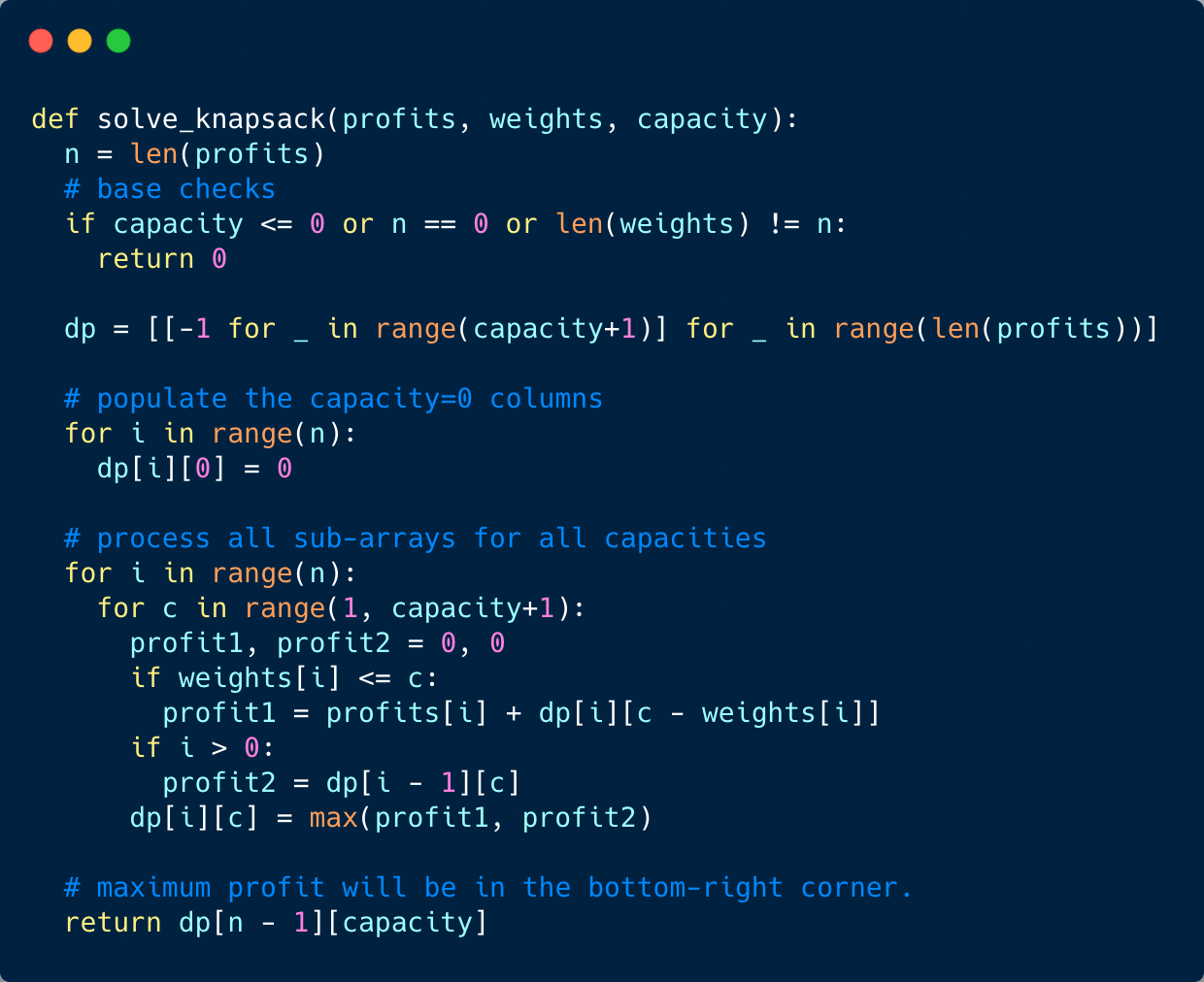 i. In this case, we will take whatever profit we get from the sub-array excluding this item => dp[i-1][c]i; if its weight is not more than the capacity. In this case, we include its profit plus whatever profit we get from the remaining capacity and from remaining items => profit[i] + dp[i-1][c-weight[i]]Finally, our optimal solution will be maximum of the above two values:
