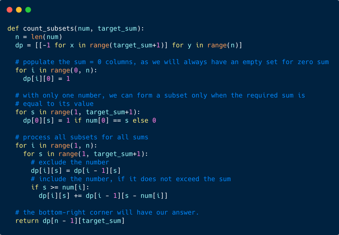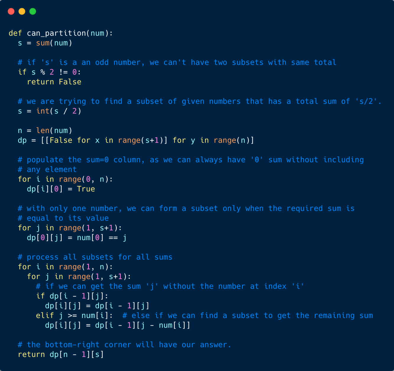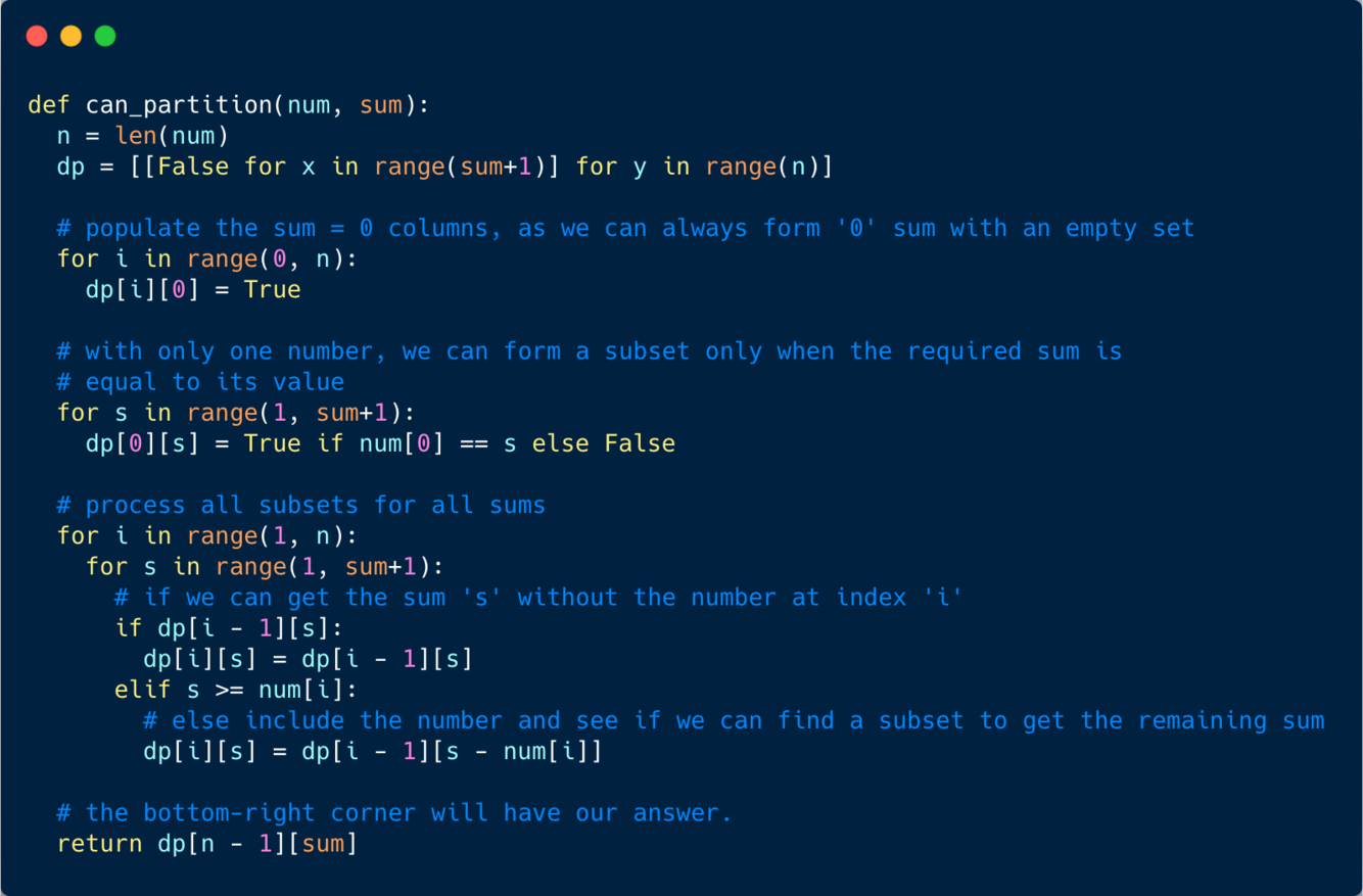 dp[i-1][s]dp[i-1][s-num[i]]If either of the two above scenarios is true, we can find a subset of numbers with a sum equal to ‘s’.