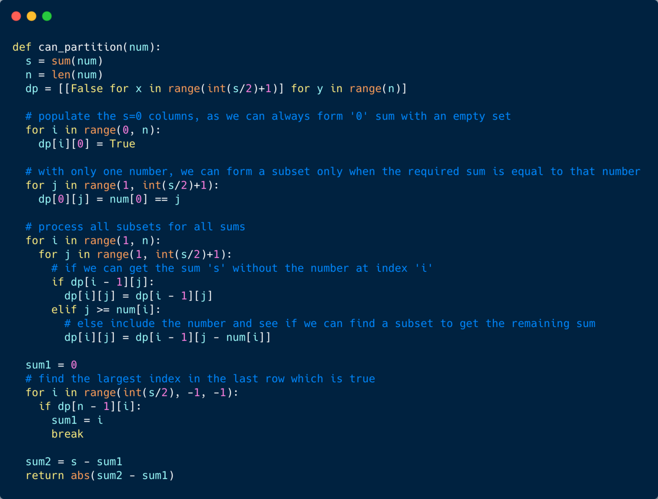Let’s try to populate our dp[][] array from the above solution, working in a bottom-up fashion. Essentially, we want to find if we can make all possible sums with every subset. This means, dp[i][s] will be ‘true’ if we can make sum ‘s’ from the first ‘i’ numbers.