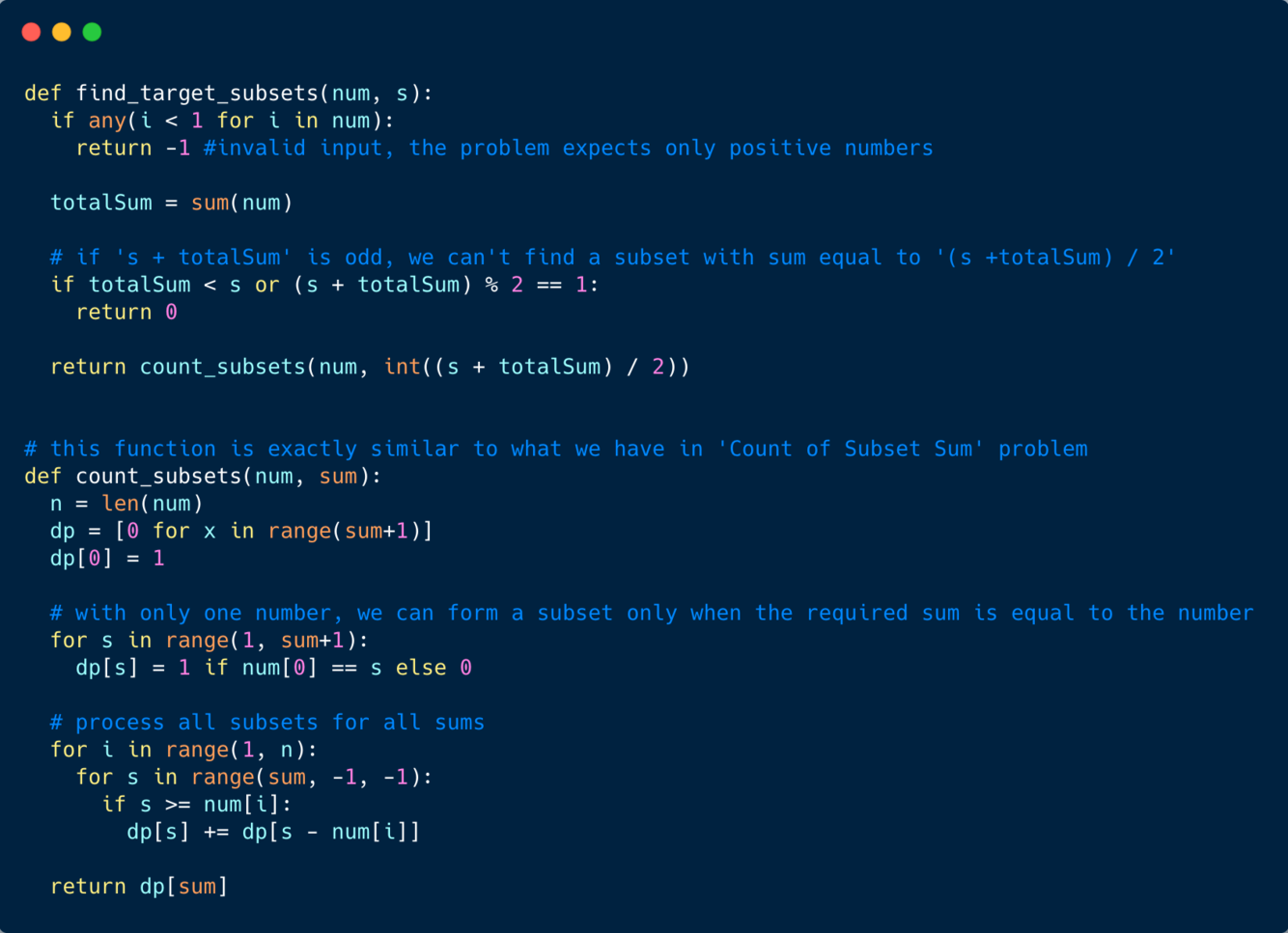 We’ll try to find if we can make all possible sums with every subset to populate the array dp[TotalNumbers][S+1].