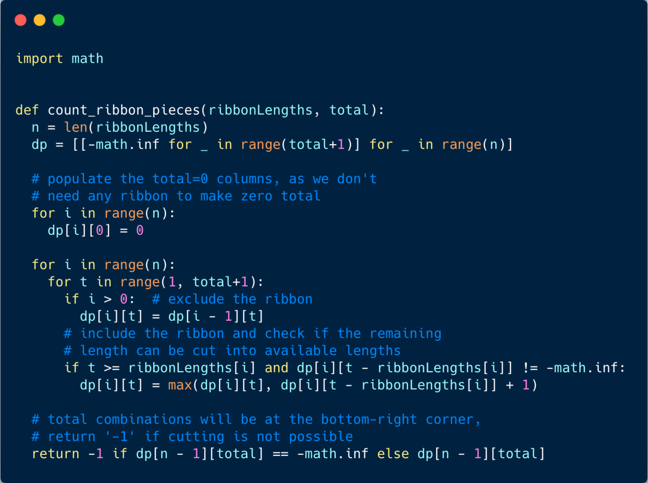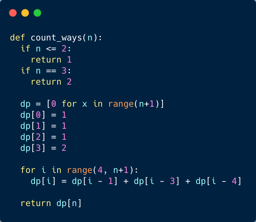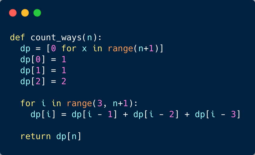 We can optimize the space used in our previous solution. We don’t need to store all the counts up to ‘n’, as we only need three previous numbers to calculate the next count.