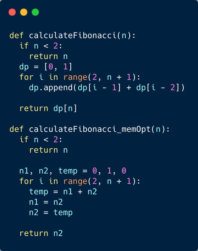 We don’t need to store all the previous numbers up to ‘n’, as we only need two previous numbers to calculate the next number in the sequence. Let’s use this fact to further improve our solution.