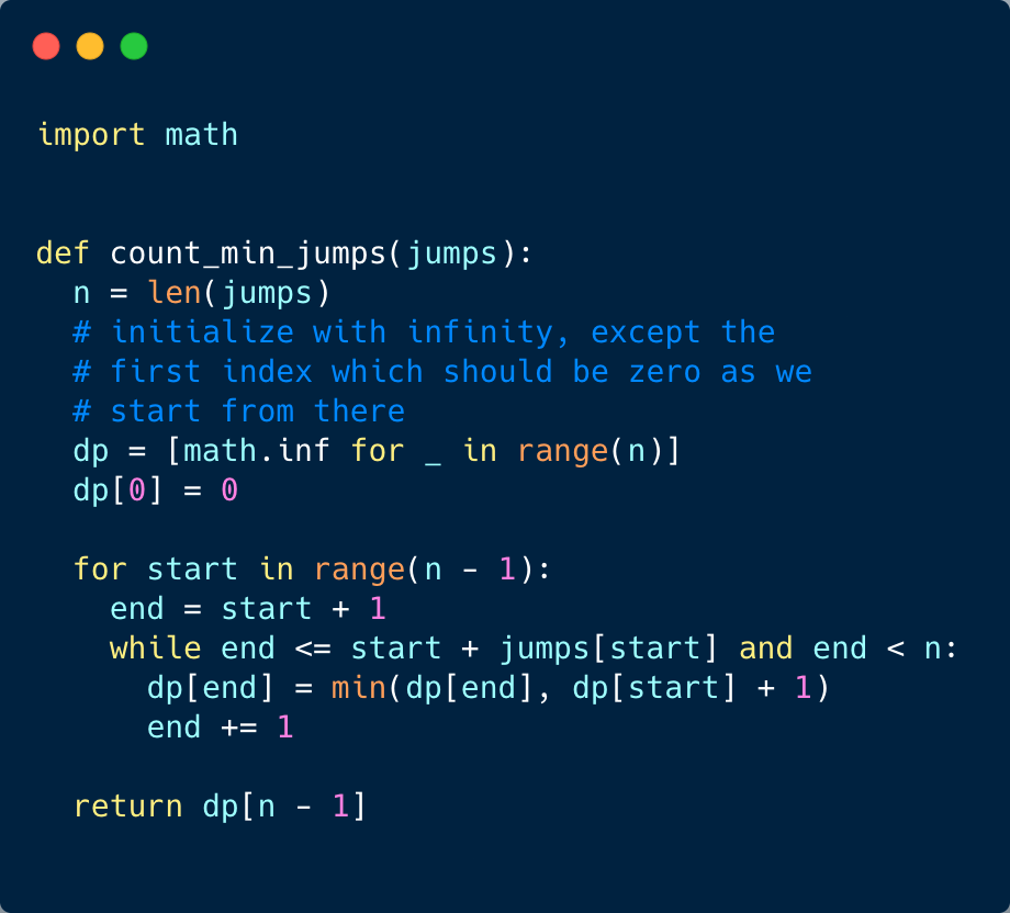 Minimum jumps to reach the end