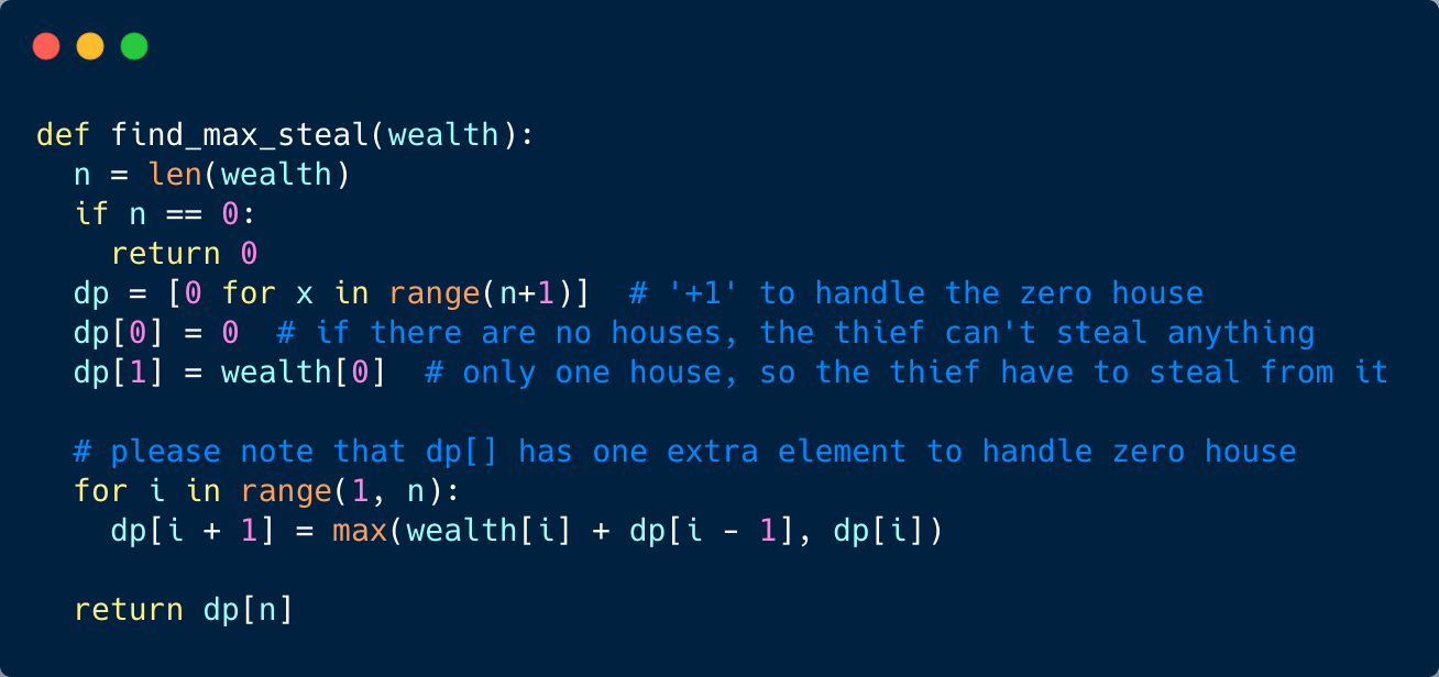 Let’s try to populate our dp[] array from the above solution, working in a bottom-up fashion. As we saw in the above code, every findMaxStealRecursive() is the maximum of the two recursive calls; we can use this fact to populate our array.