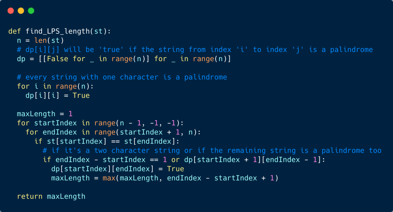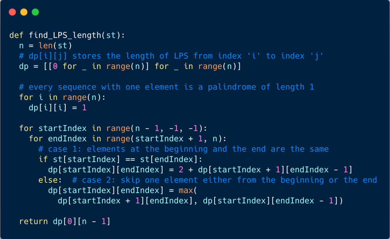 Given a sequence, find the length of its Longest Palindromic Subsequence (LPS). In a palindromic subsequence, elements read the same backward and forward.