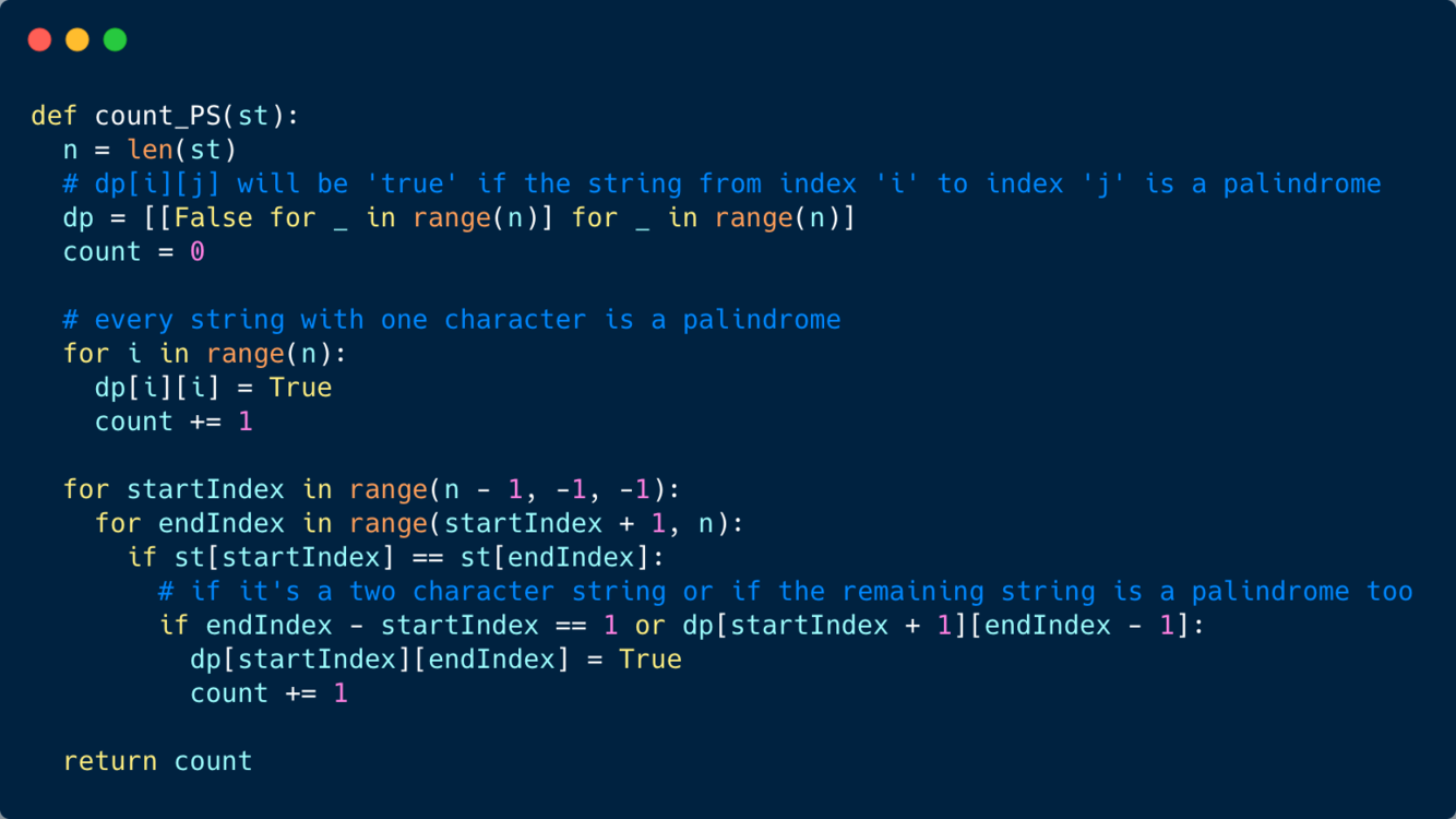 This problem follows the Longest Palindromic Subsequence pattern, and can be easily converted to Longest Palindromic Substring. The only difference is that instead of calculating the longest palindromic substring, we will instead count all the palindromic substrings.